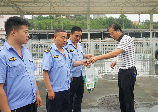 在火車站調(diào)度室,張曉強一行檢查當日帶班領(lǐng)導(dǎo)、值班人員在崗在位情況,了解值班值守落實制度、工作安排和落實等情況。為駕駛員送去了毛巾、菊花茶、花露水、風油精等降溫物品,與他們一起拉家常,詳細詢問身體情況、工作和生活現(xiàn)狀,認真傾聽面臨的困難訴求和對當前工作的意見建議,叮囑他們做好夏季防暑降溫、安全運營工作。