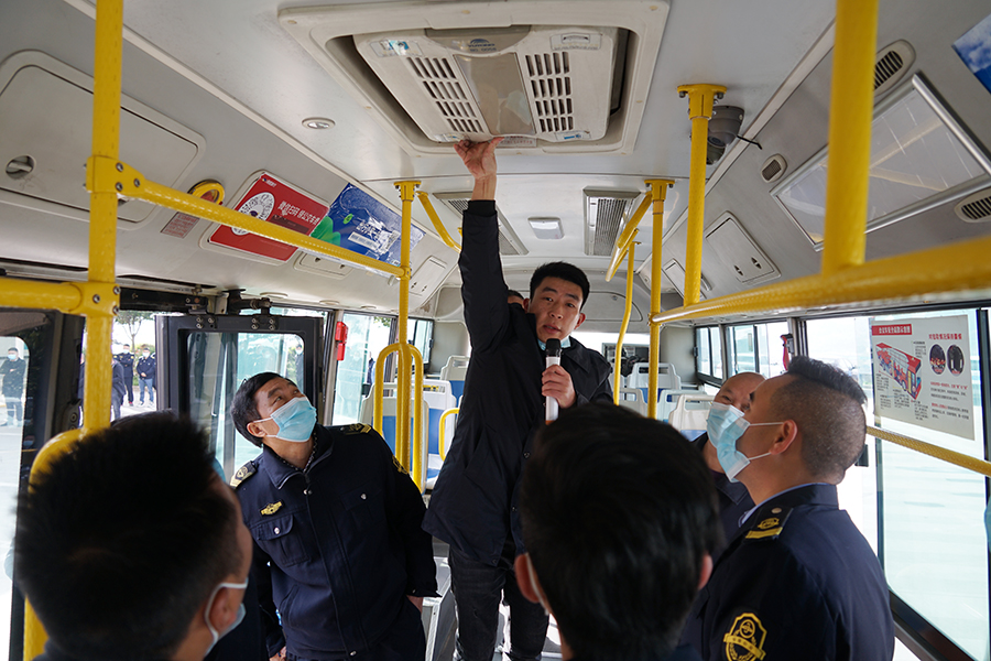 公交車(chē)靜態(tài)安全演練主要考察駕駛員對(duì)公交車(chē)內(nèi)安全錘、滅火器和手動(dòng)開(kāi)門(mén)按鈕在公交車(chē)內(nèi)放置的位置、緊急逃生路線圖是否明白清楚,如何檢查燃?xì)夤艿缆夂颓袛嗳細(xì)饪傞y等。