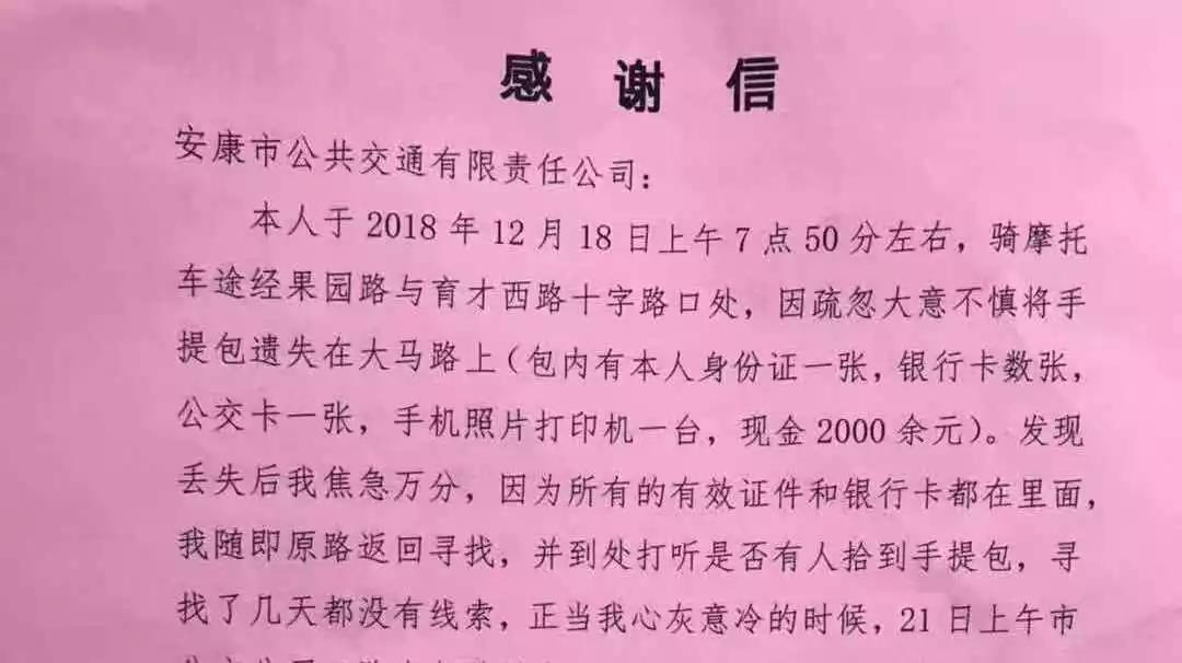 據(jù)失主吉某介紹,她是在12月18日早上的7點(diǎn)50分左右,騎摩托車途徑果園路與育才西路十字路口處,不慎將手提包遺失在馬路上。發(fā)現(xiàn)包丟失之后焦急萬(wàn)分,隨即原路返回尋找,并四處打聽是否有人拾到手提包,尋找了幾天都沒有線索,正當(dāng)她心灰意冷的時(shí)候,接到了李師傅的電話。兩人確認(rèn)后,當(dāng)天下午,失主吉某來(lái)到安康市公交公司領(lǐng)取自己遺失的手提包。并將一面印有“拾金不昧品德高尚”的錦旗和一封感謝信送到公交公司車隊(duì)辦公室。